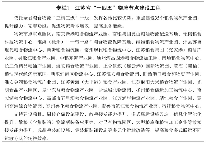 強(qiáng)化糧食物流通道能力。針對(duì)不同區(qū)域特點(diǎn)補(bǔ)齊設(shè)施短板,強(qiáng)化功能升級(jí),加強(qiáng)通道銜接,增強(qiáng)東隴海線(xiàn)、淮河出海線(xiàn)、沿長(zhǎng)江、沿海、沿京杭運(yùn)河線(xiàn)、沿連申內(nèi)河線(xiàn)“三橫三縱”糧食物流通道能力。加強(qiáng)徐州(新沂、沛縣)、連云港等糧食物流節(jié)點(diǎn)建設(shè),推動(dòng)?xùn)|隴海線(xiàn)通道鐵路糧食物流干線(xiàn)運(yùn)輸組織模式向班列化方式轉(zhuǎn)變,提高新亞歐大陸橋鐵路運(yùn)輸、鐵海聯(lián)運(yùn)和國(guó)際糧食物流通行能力。加強(qiáng)南京、泰州、蘇州、南通等散糧倉(cāng)儲(chǔ)與物流設(shè)施建設(shè),重點(diǎn)提升沿長(zhǎng)江通道糧食接卸、江海聯(lián)運(yùn)、分撥集散能力,提高服務(wù)長(zhǎng)江經(jīng)濟(jì)帶的糧食多式聯(lián)運(yùn)效率。加強(qiáng)淮安、宿遷等物流節(jié)點(diǎn)集散能力,提升沿淮河出海線(xiàn)內(nèi)河散糧運(yùn)輸和成品糧集裝箱運(yùn)輸功能。加快連云港、鹽城(大豐港)、南通(通州灣)等港口鐵路支線(xiàn)建設(shè),提升沿海通道糧食專(zhuān)用碼頭、專(zhuān)業(yè)散糧設(shè)施、多式聯(lián)運(yùn)轉(zhuǎn)運(yùn)設(shè)施、通用集裝箱裝卸設(shè)施功能。加強(qiáng)揚(yáng)州、常州、無(wú)錫等散糧倉(cāng)儲(chǔ)與物流節(jié)點(diǎn)建設(shè),提升沿京杭運(yùn)河線(xiàn)通道糧食接卸、水水中轉(zhuǎn)和分撥集散能力。加強(qiáng)連云港、鹽城、南通等多式聯(lián)運(yùn)物流節(jié)點(diǎn)與糧食產(chǎn)區(qū)對(duì)接,提升沿連申內(nèi)河線(xiàn)鐵水聯(lián)運(yùn)、河海聯(lián)運(yùn)等功能,發(fā)展鐵水散糧運(yùn)輸和成品糧集裝箱運(yùn)輸。