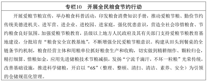 推進(jìn)重點(diǎn)環(huán)節(jié)節(jié)糧減損。加強(qiáng)糧食生產(chǎn)、儲(chǔ)存、運(yùn)輸、加工等重點(diǎn)環(huán)節(jié)的損失治理。發(fā)揮好糧食產(chǎn)后服務(wù)中心作用,著力提高糧食清理烘干能力,推動(dòng)凈糧入倉(cāng)、顆粒歸倉(cāng)。推廣運(yùn)用糧食倉(cāng)儲(chǔ)新技術(shù)、新工藝、新裝備,推動(dòng)集約儲(chǔ)糧新模式。發(fā)展新型糧食運(yùn)輸裝備,提升糧食運(yùn)輸現(xiàn)代化和裝卸智能化水平。引導(dǎo)支持企業(yè)適度加工,推廣高效低耗新技術(shù),提高成品糧出品率和原糧利用率,提高糧油加工副產(chǎn)品綜合利用率。